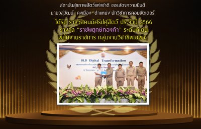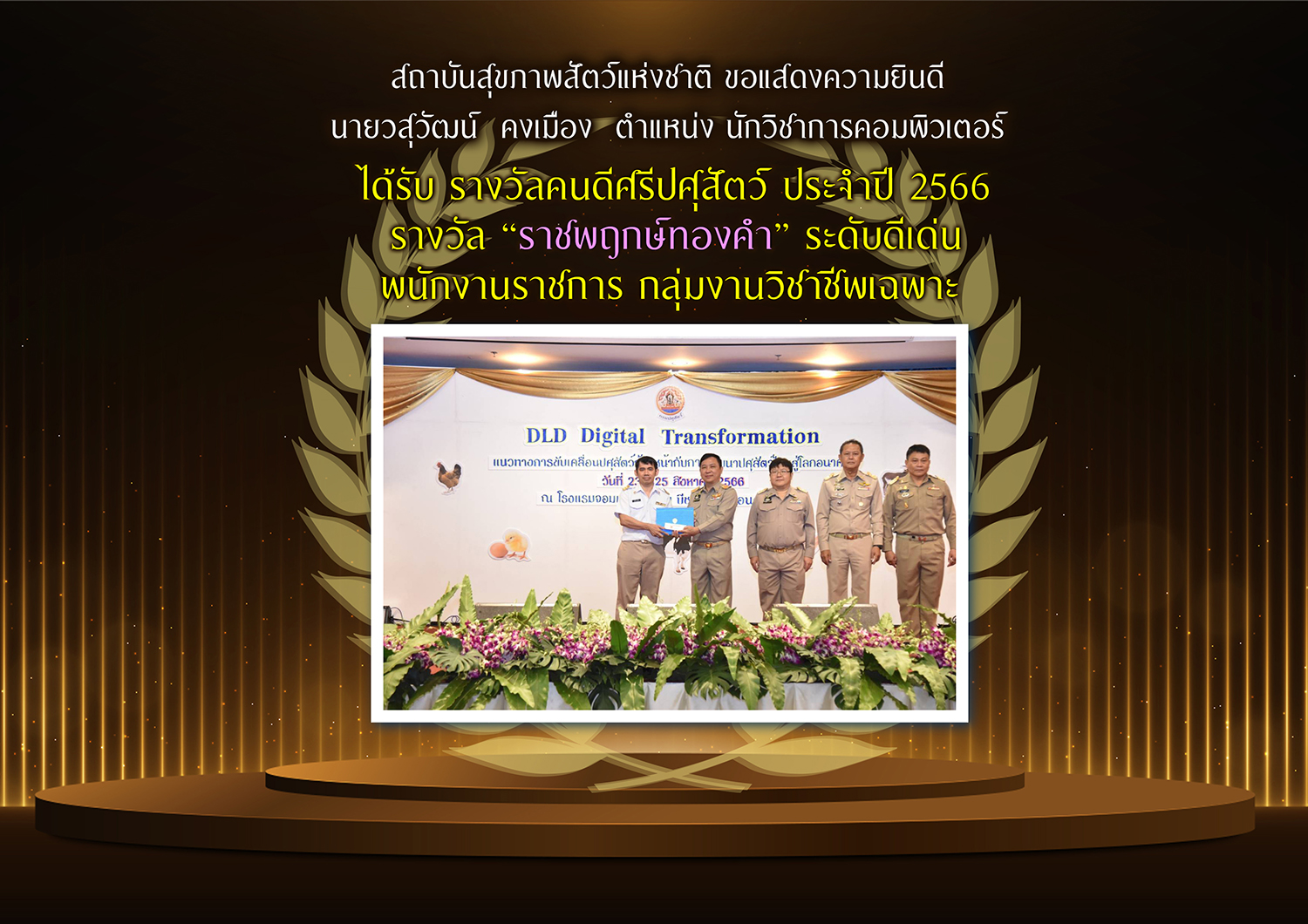 4. สถาบันสุขภาพสัตว์แห่งชาติ ขอแสดงความยินดี นายวสุวัฒน์ คงเมือง ตำแหน่ง นักวิชาการคอมพิวเตอร์ ได้รับ รางวัลคนดีศรีปศุสัตว์ ประจำปี 2566 รางวัล “ราชพฤกษ์ทองคำ” ระดับดีเด่น พนักงานราชการ กลุ่มงานวิชาชีพเฉพาะ