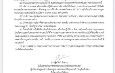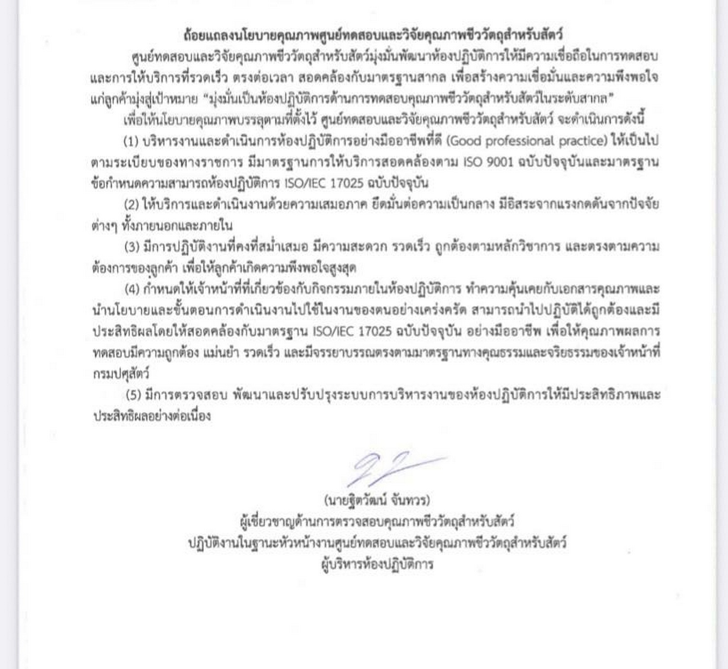 ศูนย์ทดสอบและวิจัยคุณภาพชีววัตถุสำหรับสัตว์เข้าร่วมประชุมเพื่อรับทราบถ้อยแถลงนโยบายคุณภาพ ISO/IEC 17025 และประกาศจรรยาบรรณและความซื่อสัตย์ต่อวิชาชีพของห้องปฏิบัติการ