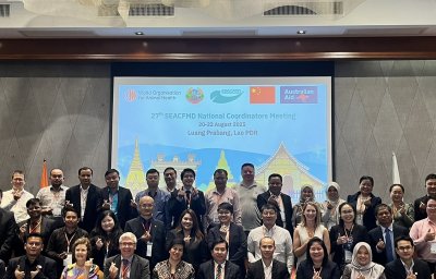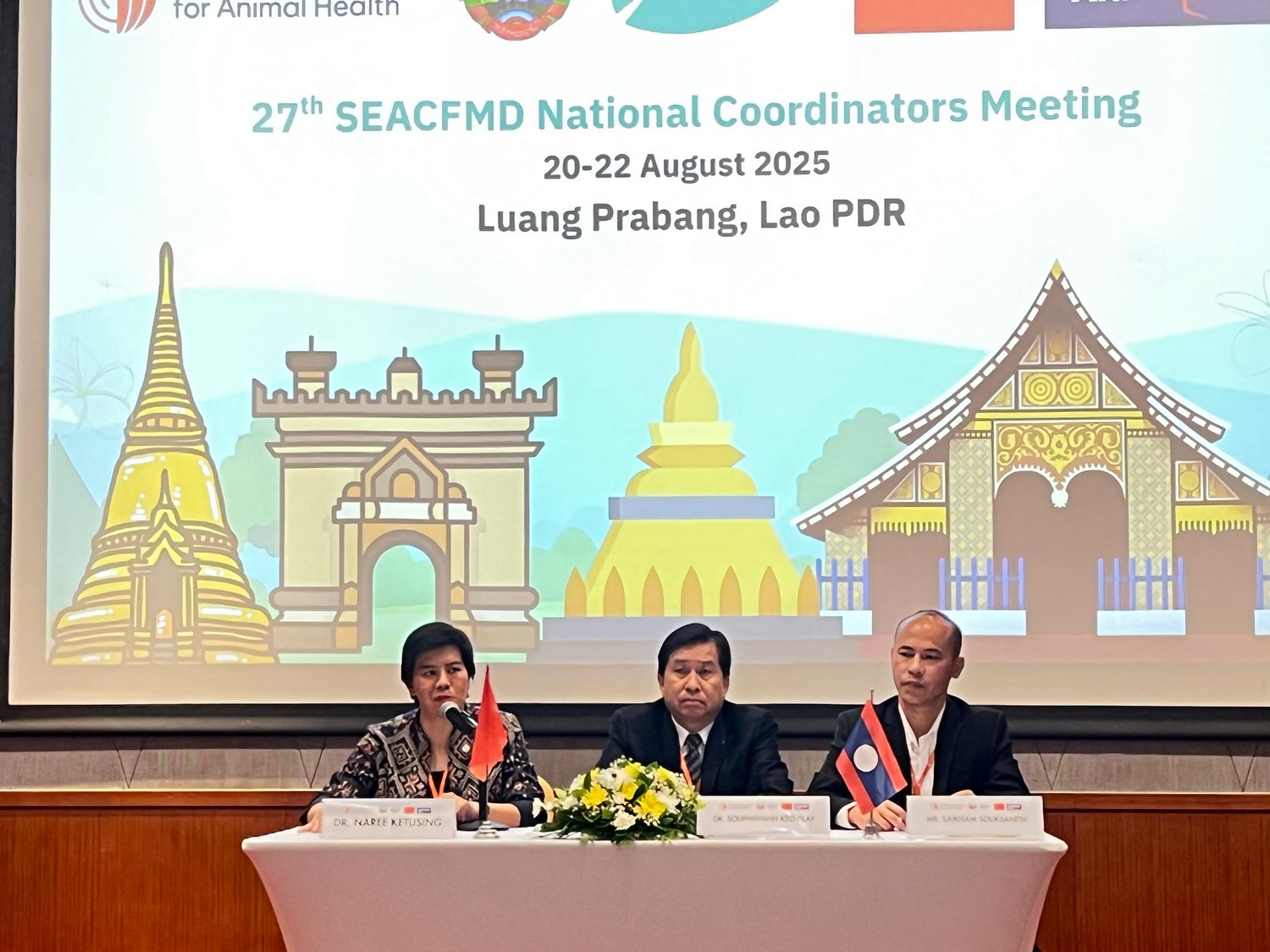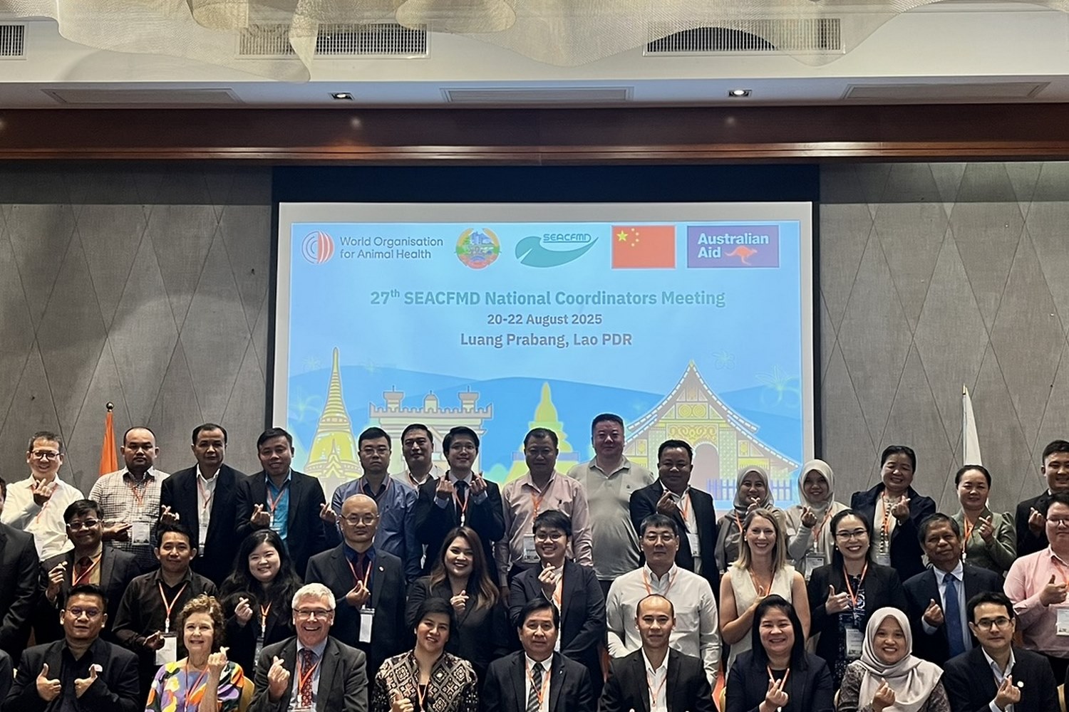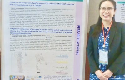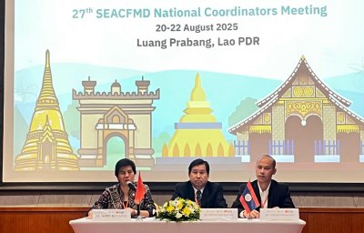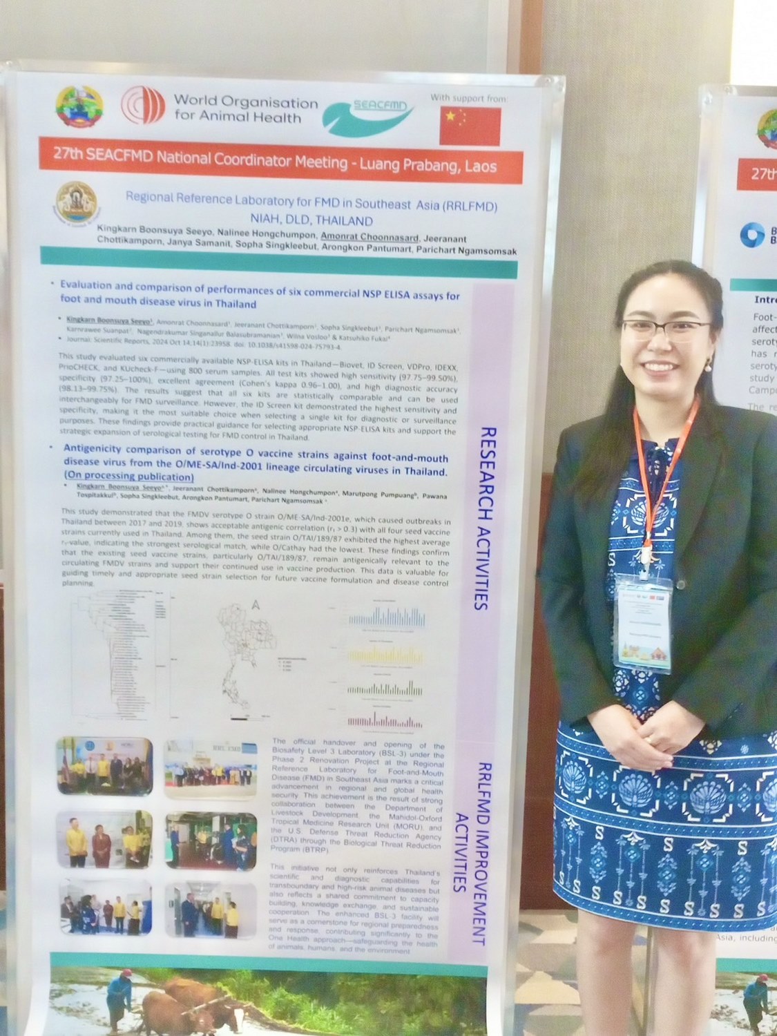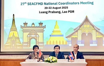 วันที่ 20-22 สิงหาคม 2568 สพ.ญ.ดร กิ่งกานต์ บุญสุยา สีโย ผู้เชี่ยวชาญด้านวินิจฉัยโรคปากและเท้าเปื่อย ปฏิบัติหน้าที่ในฐานะหัวหน้างานศูนย์อ้างอิงโรคปากและเท้าเปื่อย ภูมิภาคเอเชียตะวันออกเฉียงใต้ มอบหมายให้ สพ.ญ.ดร. อมรรัตน์ ชุณศาสตร์ นายสัตวแพทย์ชำนาญการ เข้าร่วมประชุม 27th SEACFMD National Coordinators Meeting ณ เมืองหลวงพระบาง สาธารณรัฐประชาธิปไตยประชาชนลาว โดยได้รับการสนับสนุนจากหน่วยงาน World Organisation for Animal Health (WOAH) เพื่อจัดทำ Road map ของโรคปากและเท้าเปื่อยในปี 2026-2030 ทั้งนี้ศูนย์อ้างอิงฯ ได้นำเสนอผลงานวิจัยเรื่อง “Evaluation and comparison of performances of six commercial NSP ELISA assays for foot and mouth disease virus in Thailand” และ “Antigenicity comparison of serotype O vaccine strains against foot-and-mouth disease virus from the O/ME-SA/Ind-2001 lineage circulating viruses in Thailand” ภายในงานนี้ด้วย