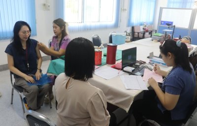 สพ.ญ.วิจิตรา อนุกูล นายสัตวแพทย์ชำนาญการพิเศษ รักษาการในตำแหน่ง ผู้อำนวยการศูนย์วิจัยและพัฒนาการสัตวแพทย์ภาคเหนือตอนบน พร้อมด้วยบุคลากรศูนย์ฯ จัดกิจกรรมการฉีดวัคซีนไข้หวัดใหญ่ โดยได้รับความอนุเคราะห์จากเจ้าหน้าที่ โรงพยาบาลห้างฉัตร อ.ห้างฉัตร จ.ลำปาง ในการดำเนินการฉีดวัคซีนแก่บุคลากรภายในศูนย์ฯ เพื่อสร้างเสริมภูมิคุ้มกันแก่บุคลากร ผู้ปฏิบัติงานในห้องปฏิบัติการและผู้ที่มีความเสี่ยงทุกกลุ่ม ตามแนวทางปฏิบัติเพื่อความปลอดภัยทางชีวภาพสำหรับการดำเนินงานของห้องปฏิบัติการ