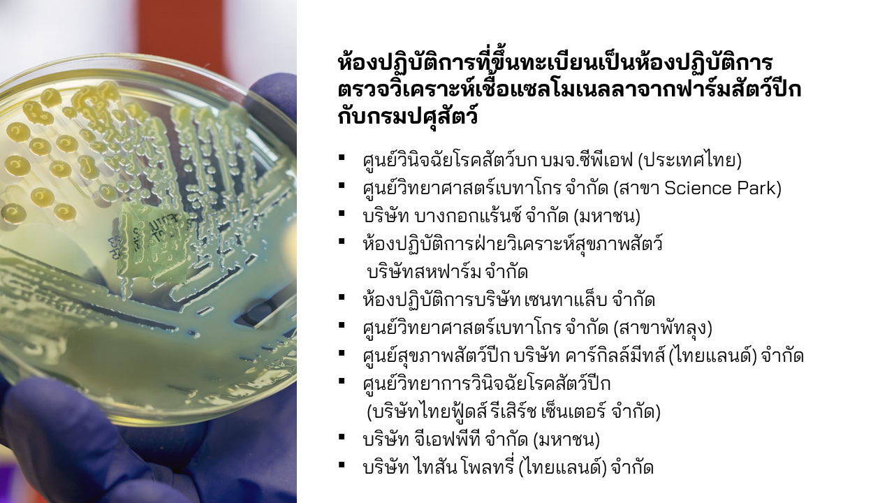- ขึ้นทะเบียนห้องปฏิบัติการที่ทำการตรวจวิเคราะห์เชื้อแซลโมเนลลาจากฟาร์มสัตว์ปีก